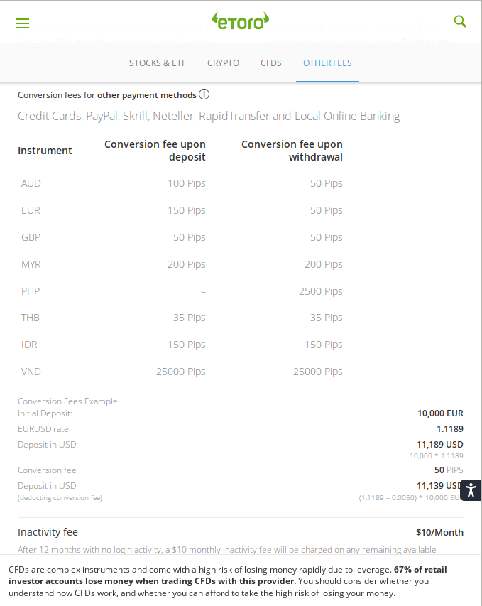 Допълнение от 2023 година: Информацията в статията може да не е актуална, по-специално тази за таксите по превалутиране, защото eToro са пуснали нова услуга eToro Money, за която казват, че може да се прави превалутиране без такса. Не съм детайлно запознат с нея.
